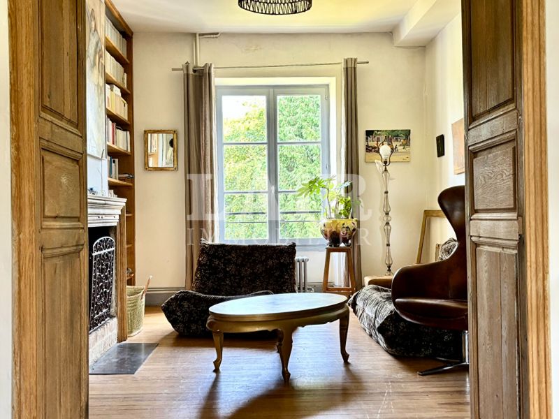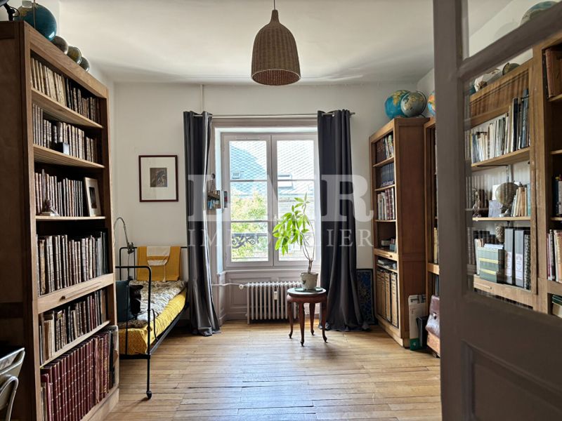 Au 2e etage de ce bel immeuble, decouvrez cet appartement traversant et a la decoration raffinee, offrant une surface d\'environ 157m2 (loi carrez, et 190m2 au sol) en duplex. Entierement parquete et en parfait etat, il comprend : une entree qui dessert une cuisine independante avec vue sur le parc prive, un bureau / bibliotheque, une grande piece de vie lumineuse et traversante ouverte sur un petit salon cozy avec sa cheminee fonctionnelle. A la suite un degagement avec WC et salle de bain. Un escalier vous conduit a l\'etage avec 3 belles chambres avec tomettes anciennes, un dressing, une salle d\'eau et une 4e chambre.