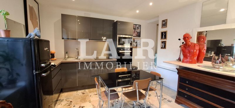 Au rez-de-chaussee, vous trouverez une grande piece de vie avec une cuisine amenagee et equipee, ainsi qu\'une arriere-piece disposant des raccords pour une machine a laver et offrant quelques espaces de rangement. Un toilette complete ce niveau.