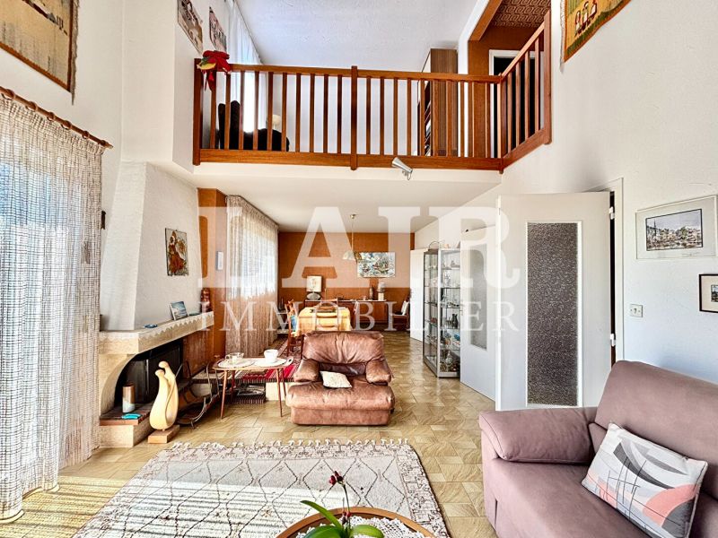 il offre au rez-de-chaussee : une entree spacieuse avec rangements, un sejour-salon lumineux avec de belles baies-vitrees et une mezzanine, acces a une terrasse dallee, cuisine independante amenagee, arriere cuisine.